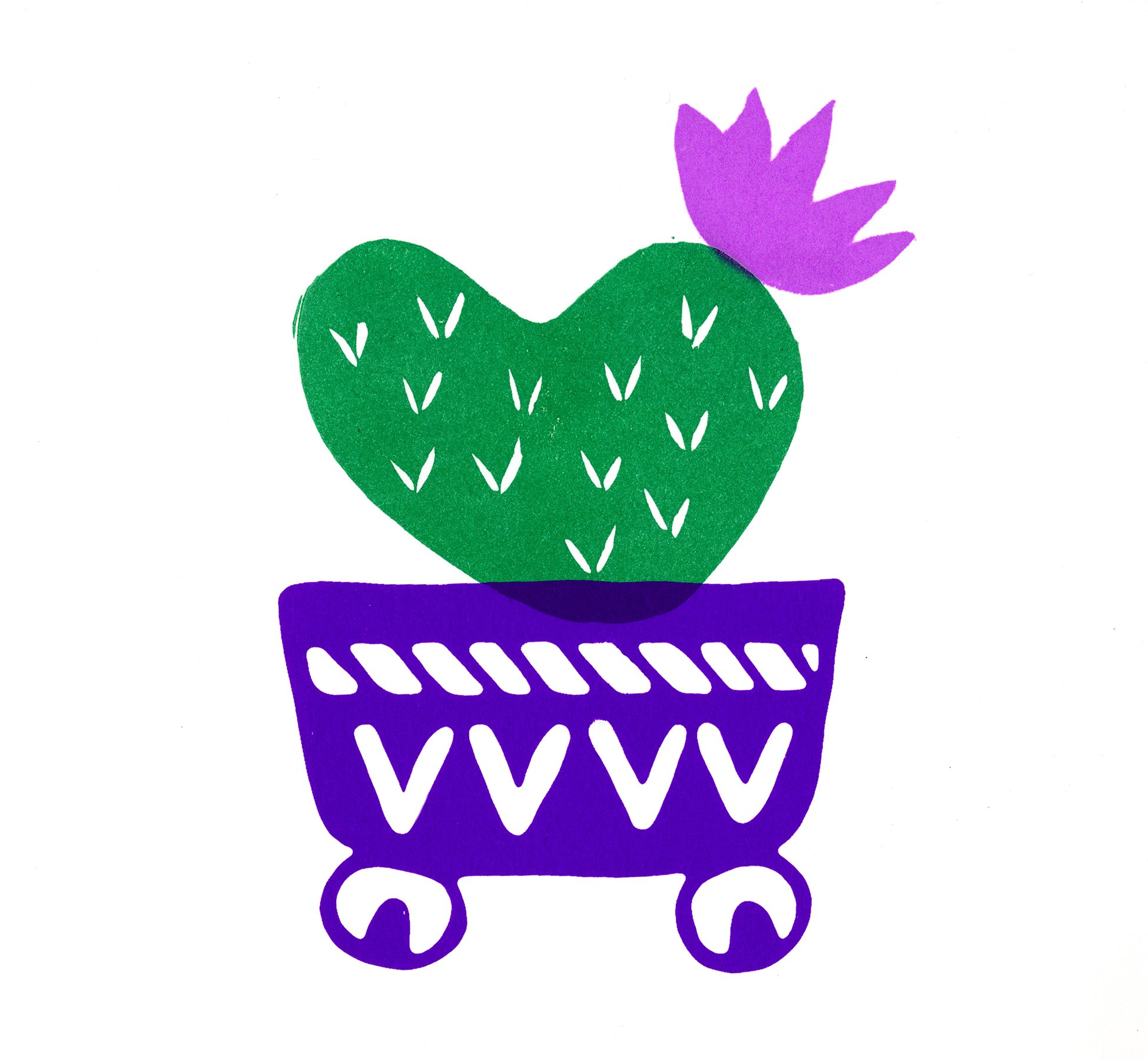 This print is the last from the period of time where I was in recovery from lung cancer surgery. The recovery after having a major portion of my right lung removed was a delicate one and it was impossible for me to engage in the physically laborious practice of screenprinting. Instead I took to carving relief stamps. I took my time and prioritized my healing. It was only this week, three years later, that the little corazon de nopal got planted in it's own little pot (this portion is screenprinted). Like me it has taken time to come to rest with ease in place.