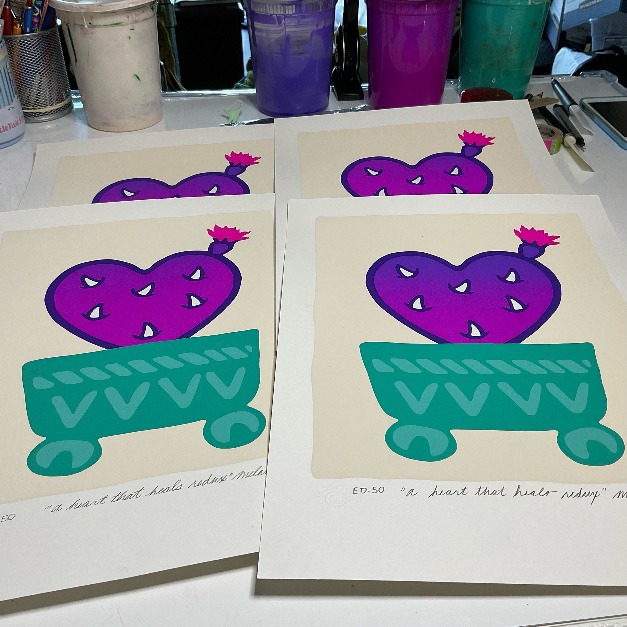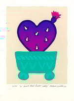 This print is the last from the period of time where I was in recovery from lung cancer surgery. The recovery after having a major portion of my right lung removed was a delicate one and it was impossible for me to engage in the physically laborious practice of screenprinting. Instead I took to carving relief stamps. I took my time and prioritized my healing. It was only this week, three years later, that the little corazon de nopal got planted in it's own little pot (this portion is screenprinted). Like me it has taken time to come to rest with ease in place.
