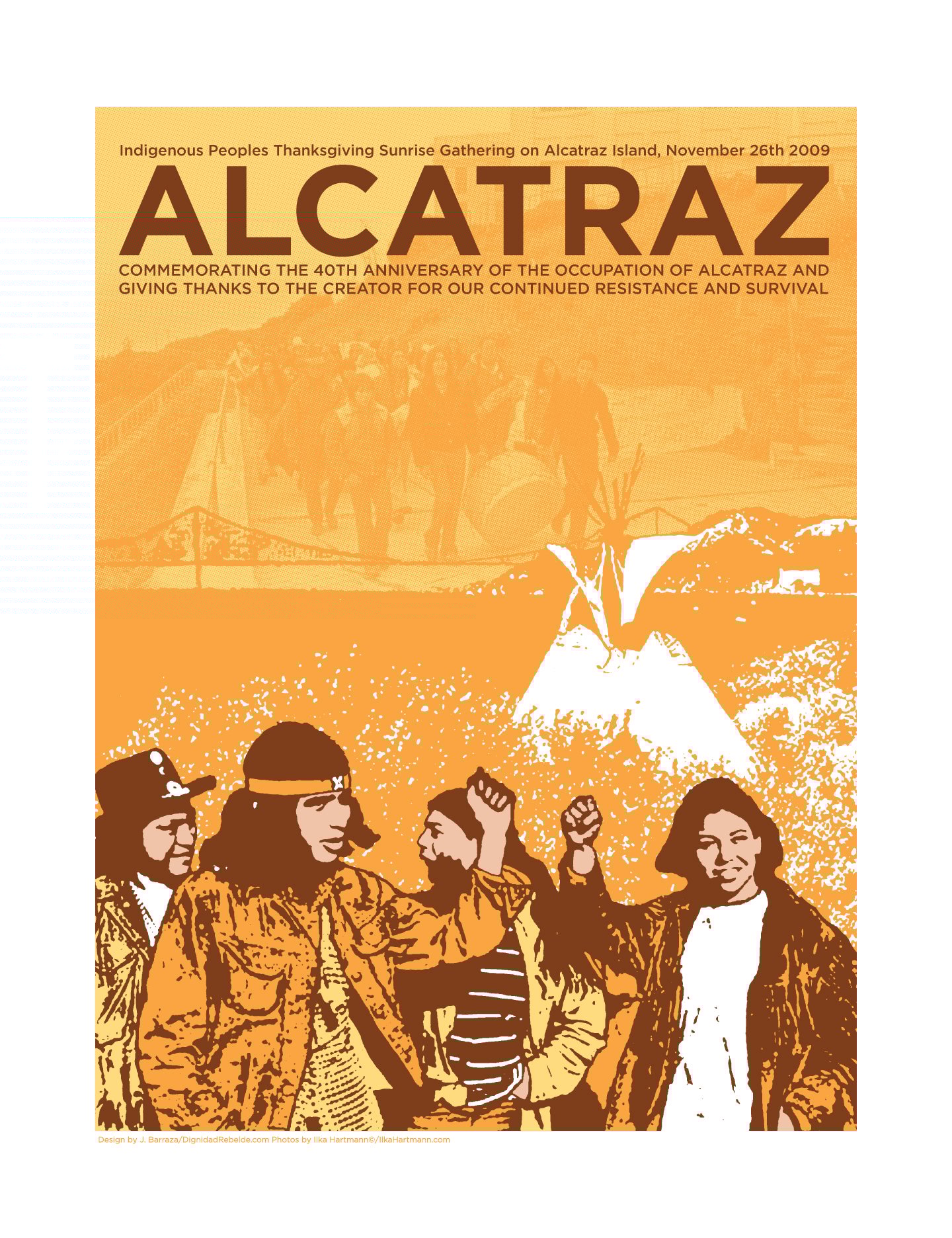 I created this print to celebrate the 40th anniversary of the occupation of Alcatraz by Indians of all Tribes and share them with the community. I designed and printed a poster last year to give away at the sunrise ceremony at Alcatraz. It was a lot of fun giving away poster and people's reaction when i told them they were free. We wanted to do something similar for this years sunrise ceremony on Thanksgiving day. This year we made 300 small posters to give away to the community and an edition of large screen printed posters to share with the organizations that help make the ceremony possible.