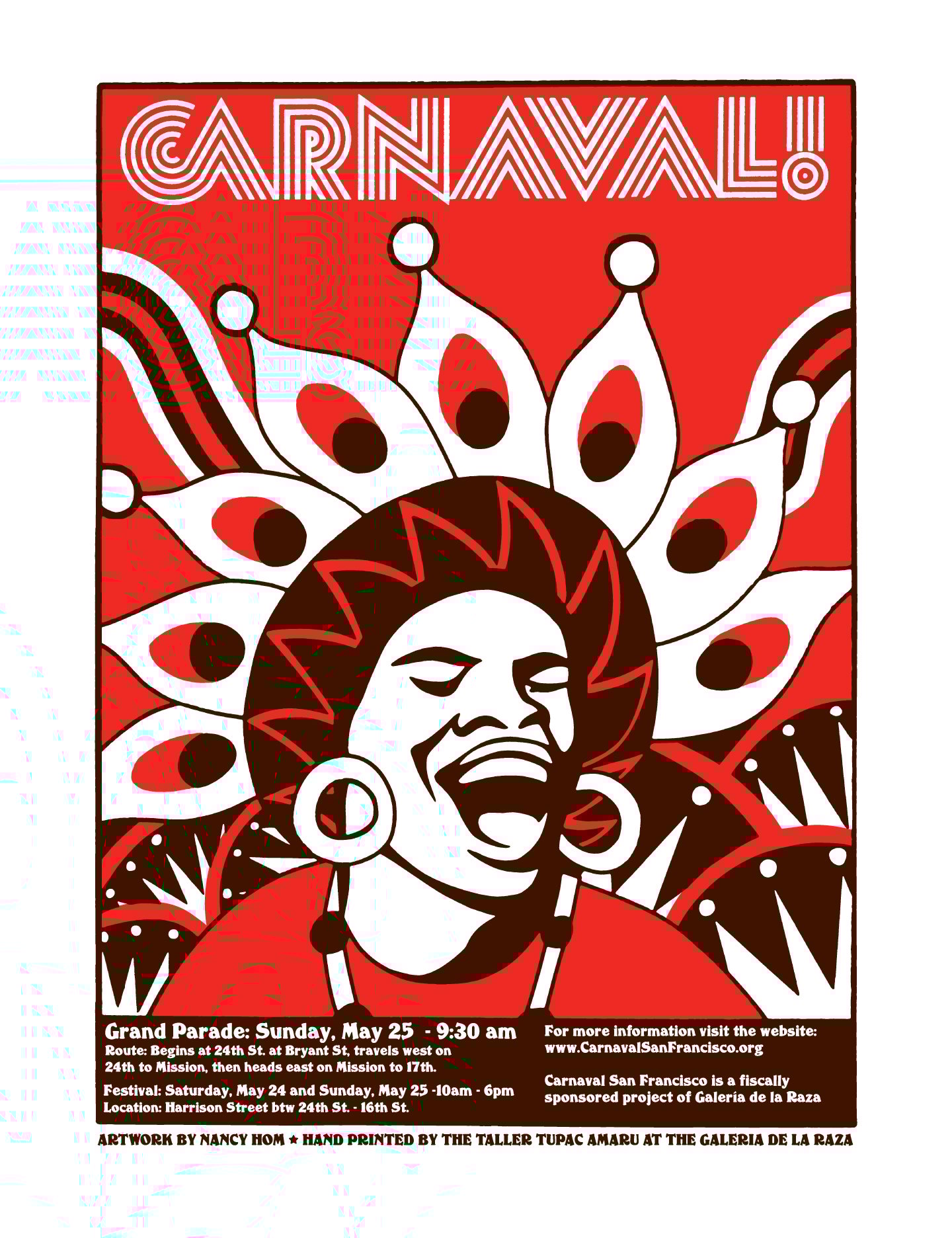 This is a re-working of a poster made by Nancy Hom for Carnaval San Francisco in the 1970s, this version was created to honor and revitalize the festival in 2013. These posters were printed with Nancy at the Galeria de la Raza during the Empujando Tinta exhibit and they were posted in the Mission and beyond to spread word of the festival.