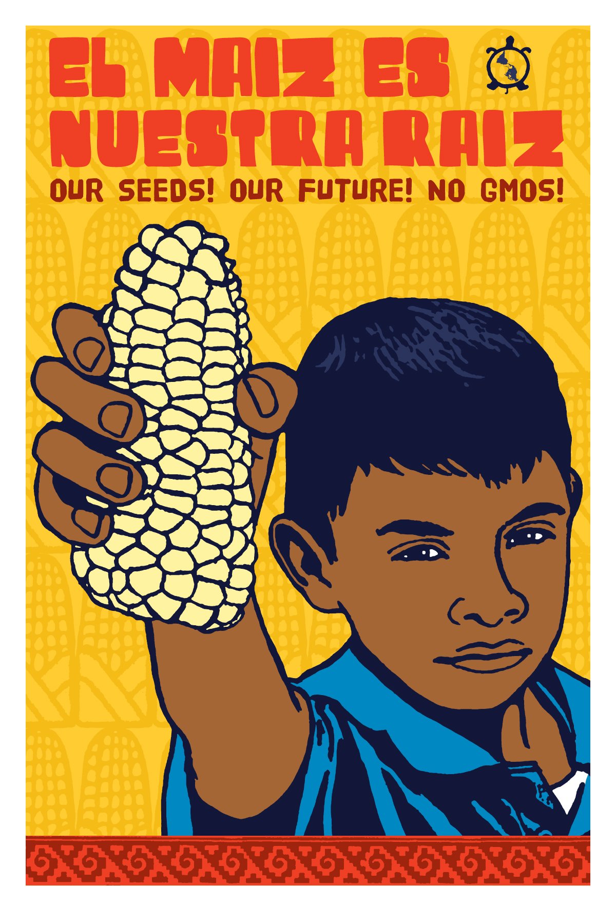 This print is called Corn People and is a reflection on the spiritual, cultural and material devastation that Genetically Modified "foods" like corn have on many populations through the Americas and the world. It presents a young boy holding on to our future and biodiversity as refelected in the corn in his hand.