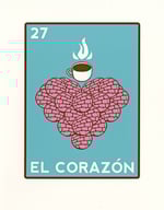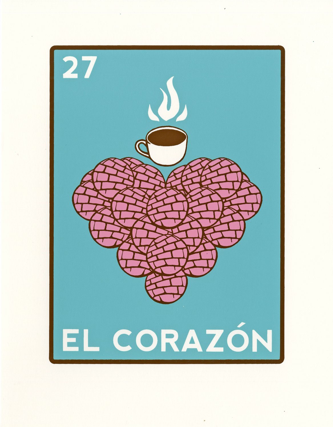 El Corazon (de Pan Dulce) is my first take on the popular Loteria iconography. There are 54 uniquely designed cards in game Loteria. The Mexican game of chance holds a a special place in many my heart because I remember raucous games with 54 being played among family members both in Mexico and the U.S.