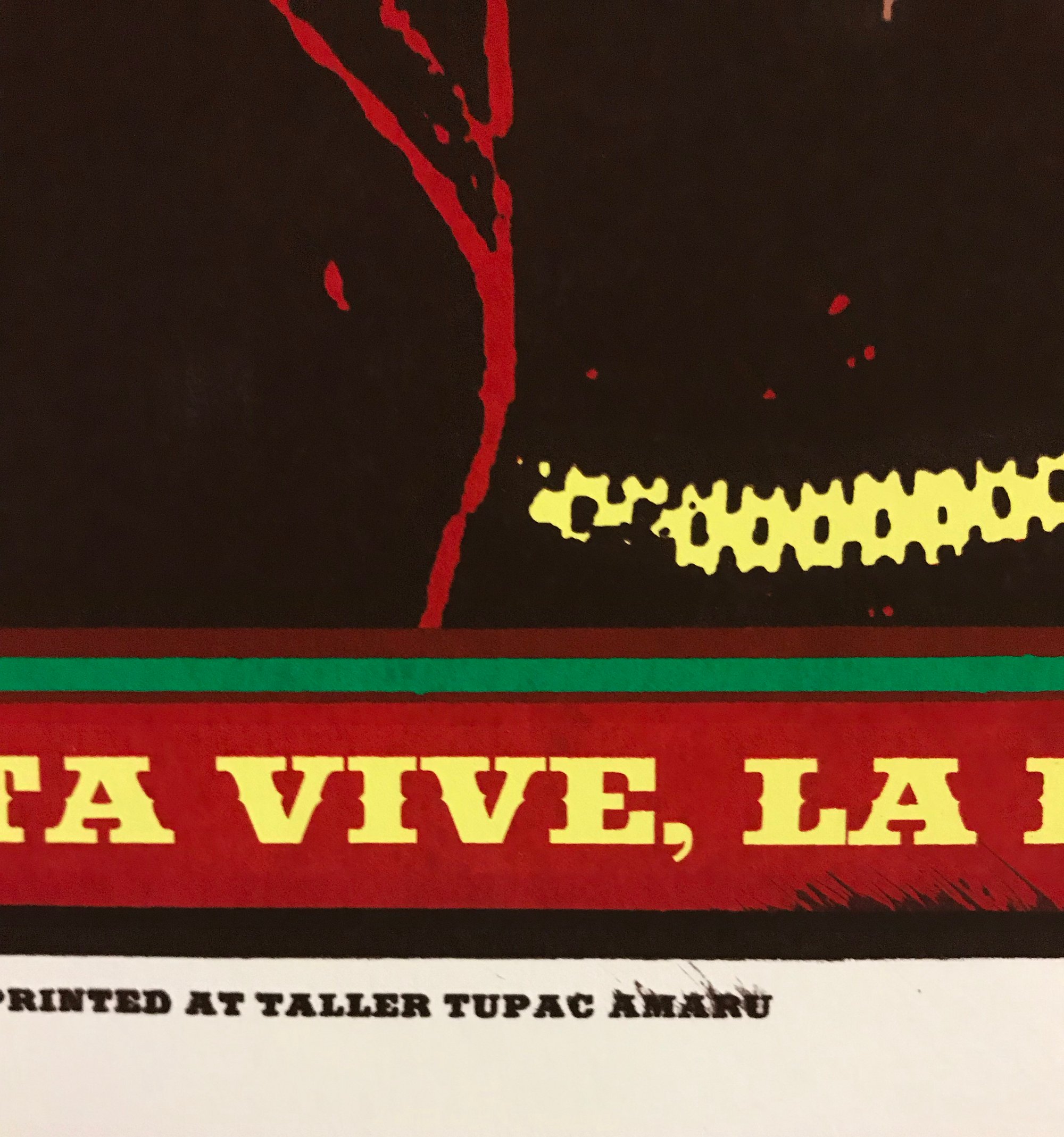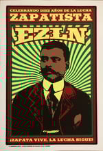This print was created to celebrate the 10th anniversary of the Zapatista uprising in the Chiapas, Mexico. The Zapatistas have been fighting under the flag of land and liberty, setting up autonomous communities where people can live with dignity.