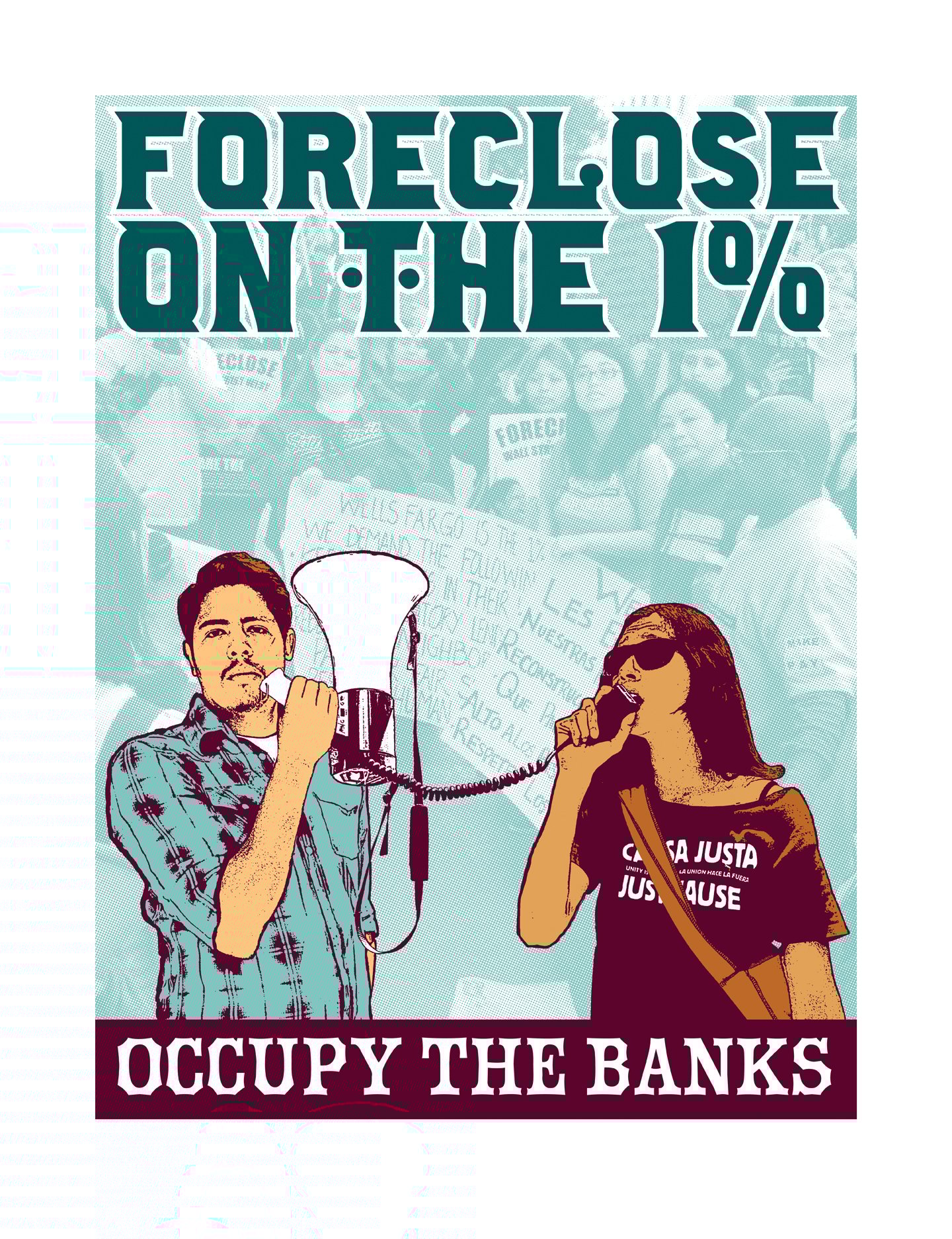 This poster was developed for the bank actions happening this week in Oakland to show my solidarity with all those who are challenging the Big Banks to demand a moratorium on foreclosures and to stop its investments in detention centers and dirty energy and to hold them accountable for their role in causing our economic crisis.