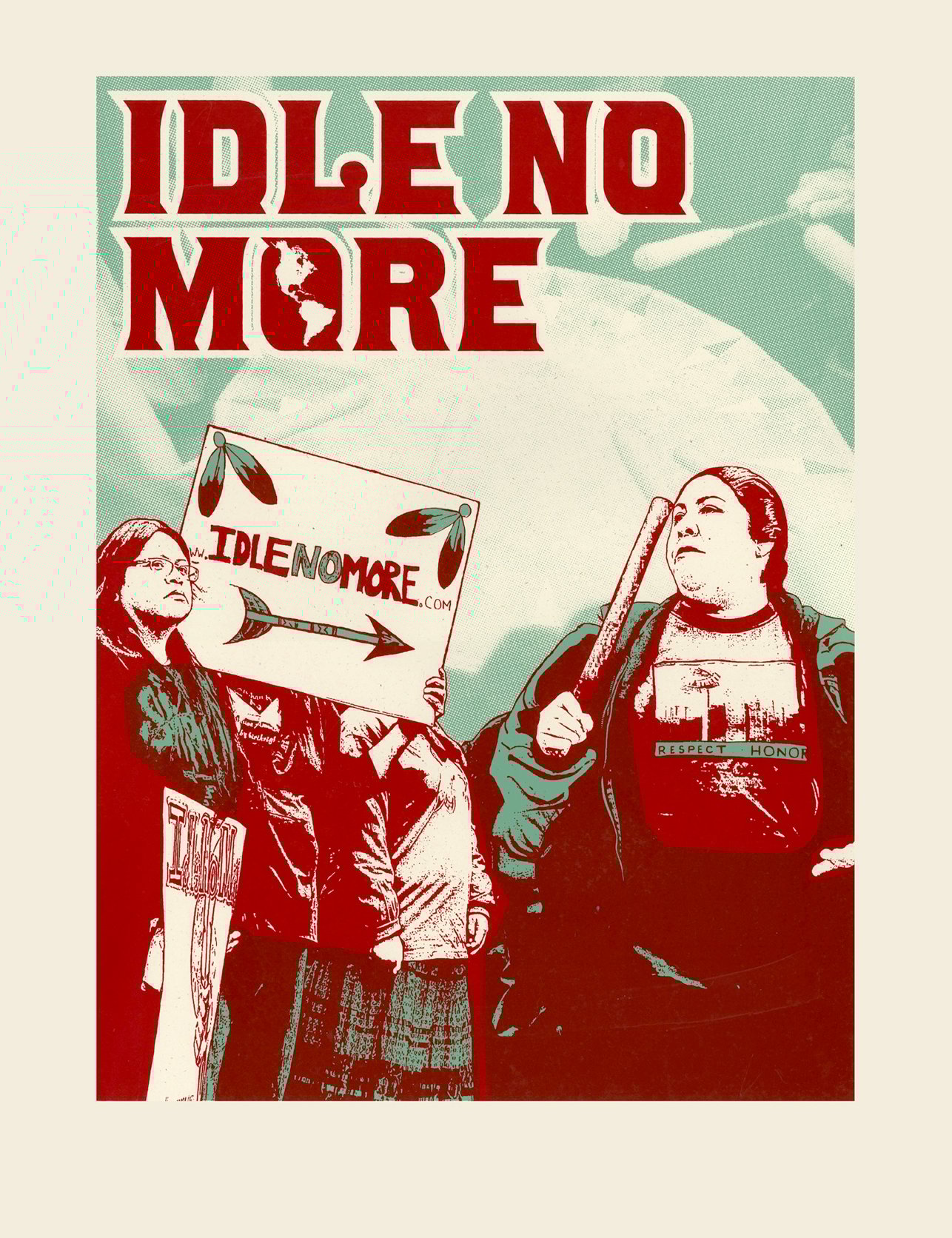 This is a poster created to support IDLE NO MORE movement, I' was super inspired by the work this movement and printed a few hundred of these that were given away at rallies around Norther California. I have a few left and wanted to sell some of these to cover the supplies used to make them.