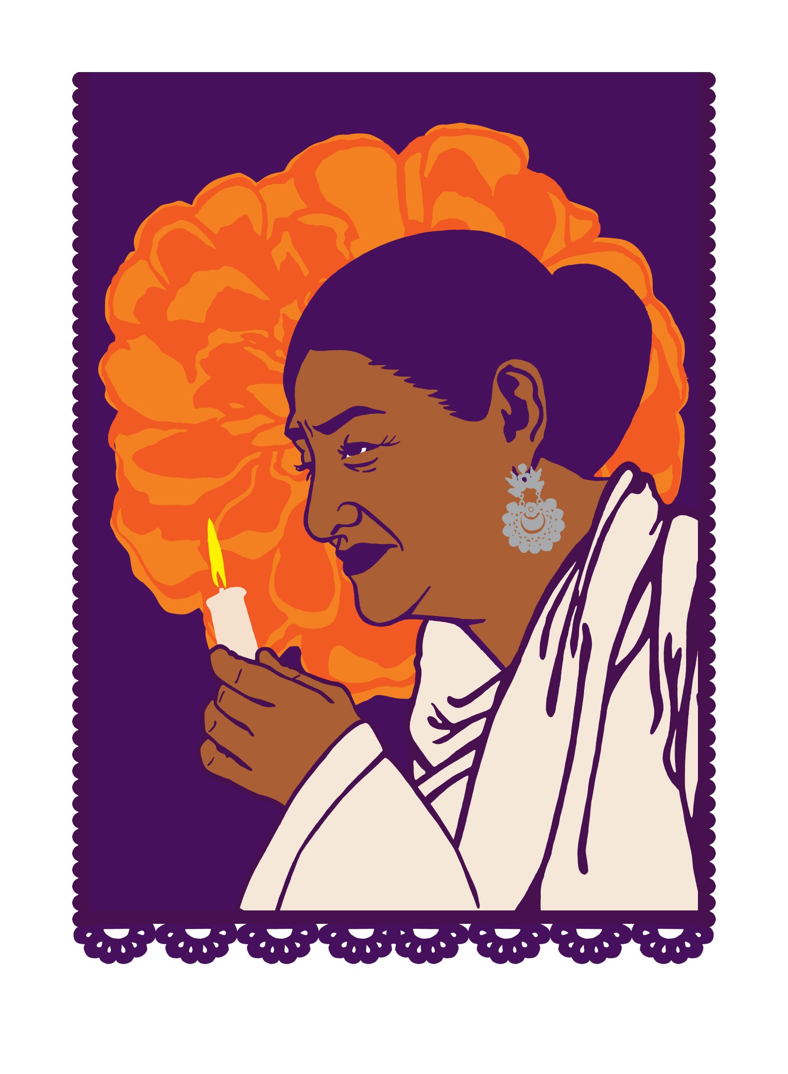 So when thinking about what rituals and symbols are central and important for me I decided to use the cempasuchil which is given as an ofrenda on altares and in cemeteries. I also hinted at papel picado around the edge of the print. The lighting of the candles to guide the spirits of the ancestors home is a reflection of a larger worldview that understands the connection between our lives and corporeal bodies and the spirits of the ones who came before us. This is why Dia de los Muertos has always moved me deeply...because it opens space for us to come together and remember communally. And that remembering is one of the most revolutionary acts against the forced amnesia that is often imposed on our communities by systems that benefit from the violence of forgetting.
