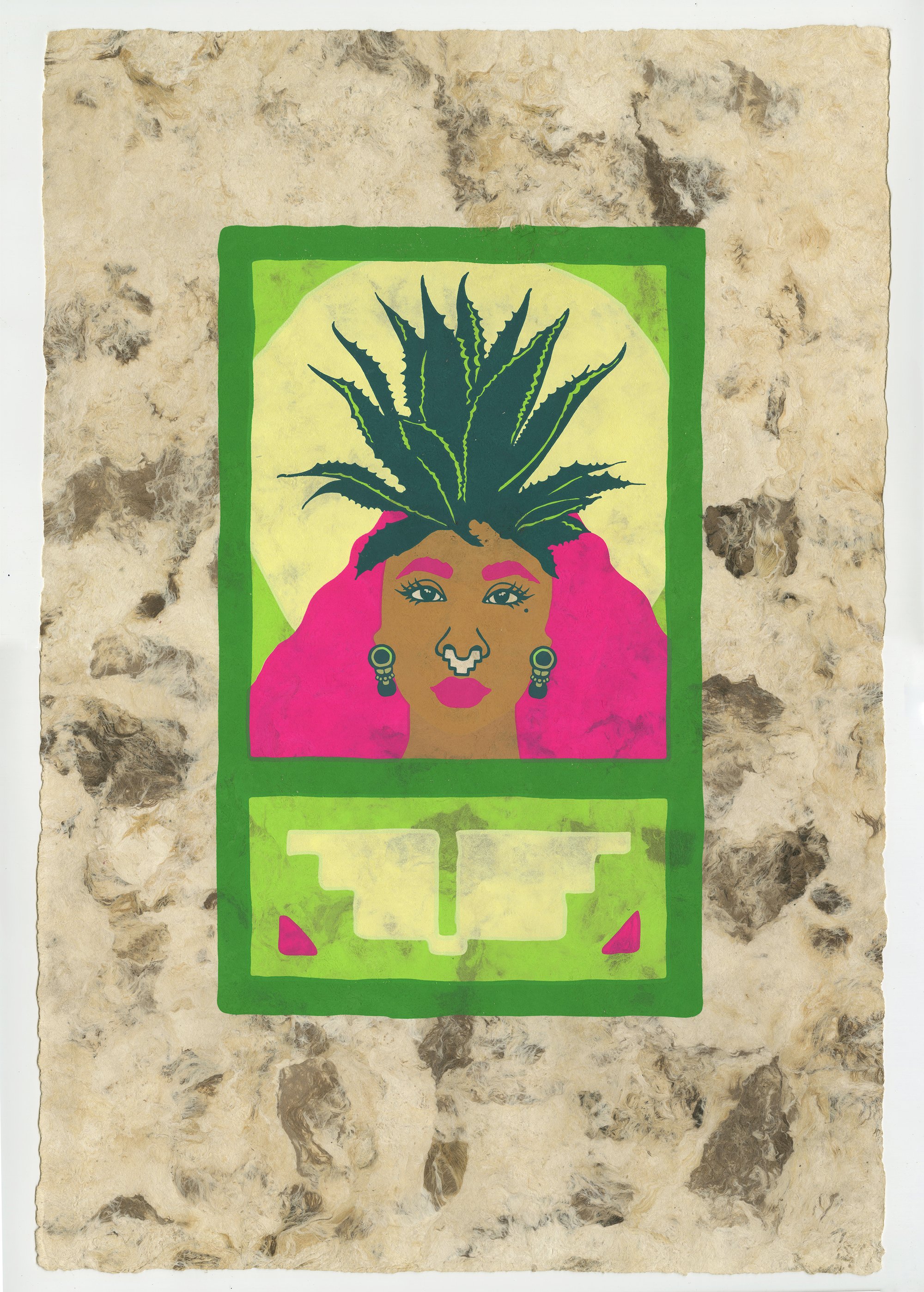 The maguey plant is a plantita that many of our families have in our homes and use on a regular basis. This is the first of series on memory, healing and the endurance of our old ways. I wanted to create a portrait of a contemporary representation of Mayahuel with details such as the yacametzli, a nose ornament used in pre-invasion times represented here as a modern day septum piercing. The iconography is based on multiple depictions of Mayahuel is different codices, pictoral books that told of ceremonies and the Mexica cosmovision, and reinterpreted as a person from my community.