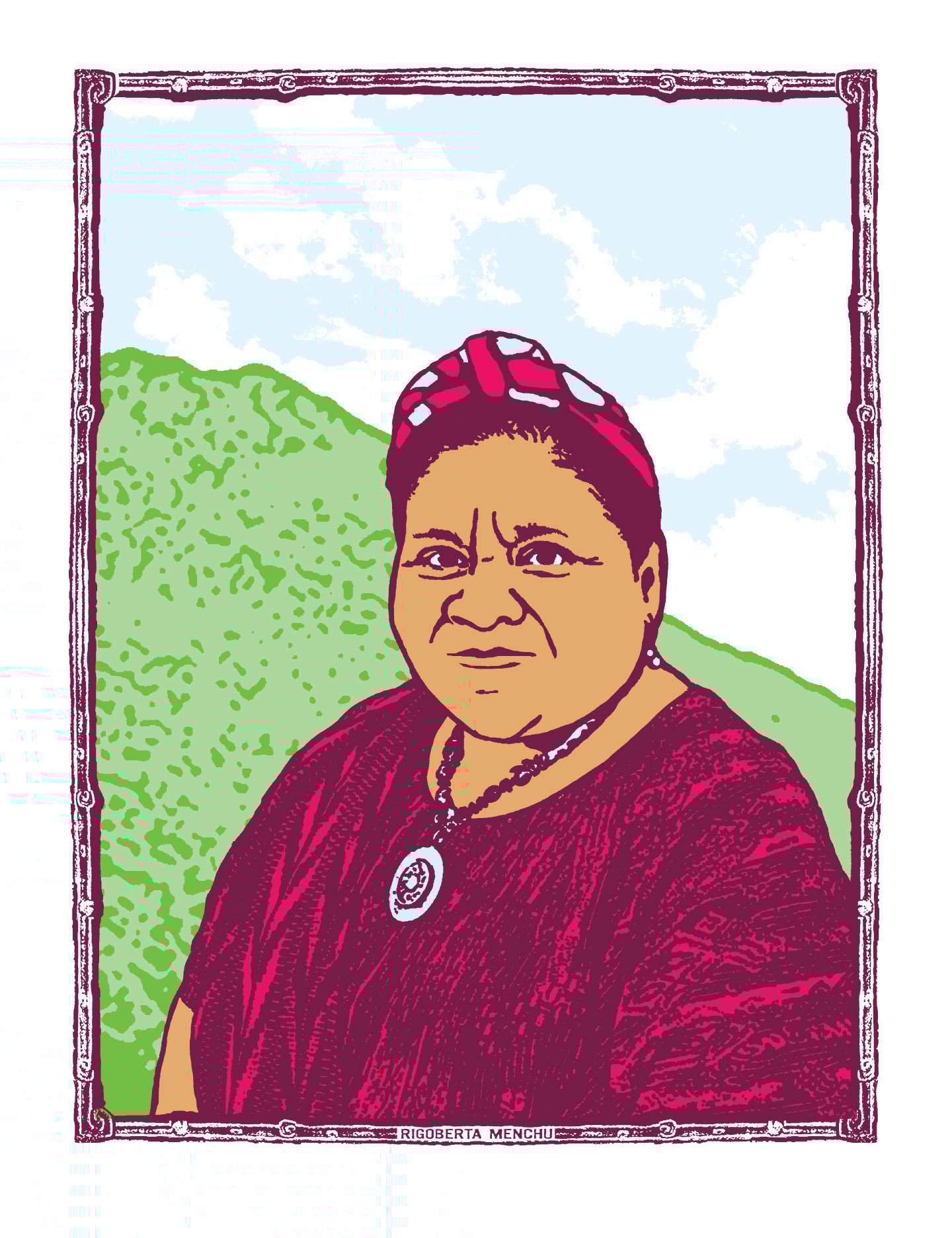 I created a portrait of Rigoberta Menchú Tum, a Quiche-Maya from Guatemala, in order to lift up a woman who has helped call attention to the genocidal policies that have been carried out against indigenous people. It is important to understand Rigoberta's story. She helped her family with farm work as a young person and attended school where she received up to an eighth grade education. She was also a major proponent of women's rights when she was only a teenager. She has been recognized for her activist organizing against violations of human rights and genocide committed by the Guatemalan army. In 1991, Menchú participated in the ongoing preparation by the United Nations of its Declaration on the Rights of Indigenous Peoples which was most recently ratified. Menchu was the 1992 Nobel Peace Prize Laureate in recognition of her social justice and ethno-cultural reconciliation work based on respect for the rights of indigenous people.