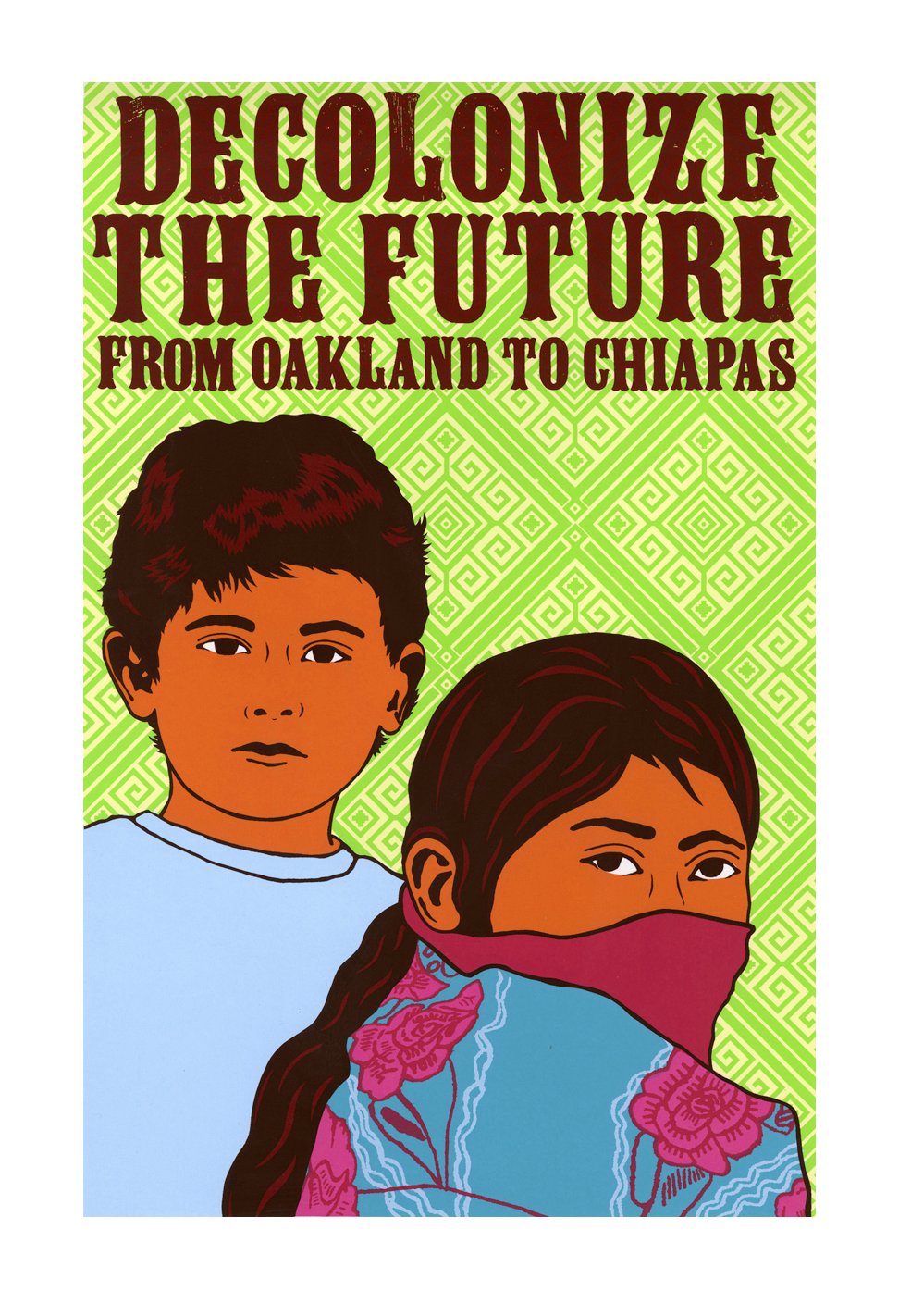 This print reflects on the solidarity that exist between struggles happening in places like Chiapas and Oakland, where there are movements happening of people coming together to organize their community to build a sustainable future.