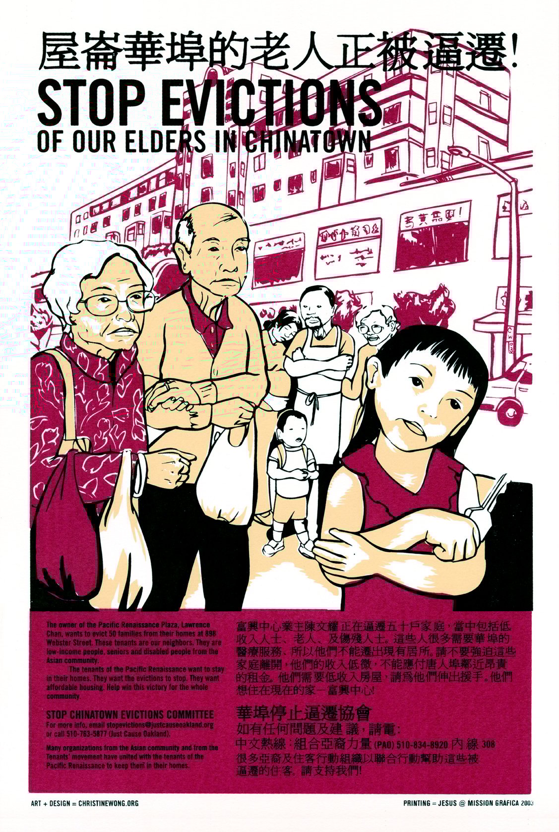 This poster was designed by Christine Wong Yap for Just Cause Oakland to help them with their campaign in Oakland's Chinatown to stop the evictions of elders from their homes at Pacific Renaissance. I printed it at Mission Grafica where I first learned to print before we started the Taller Tupac Amaru.