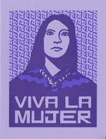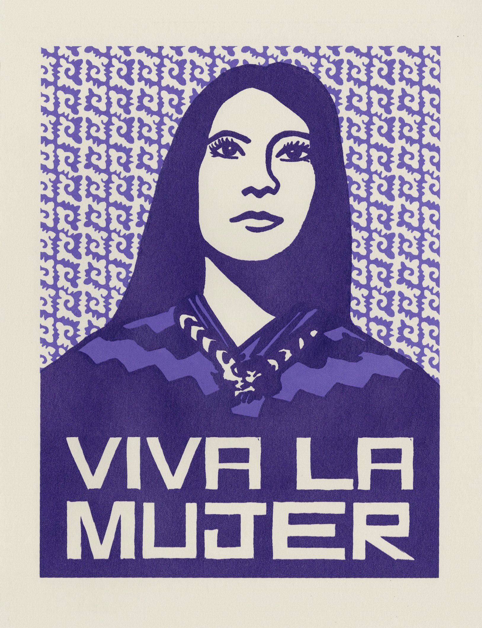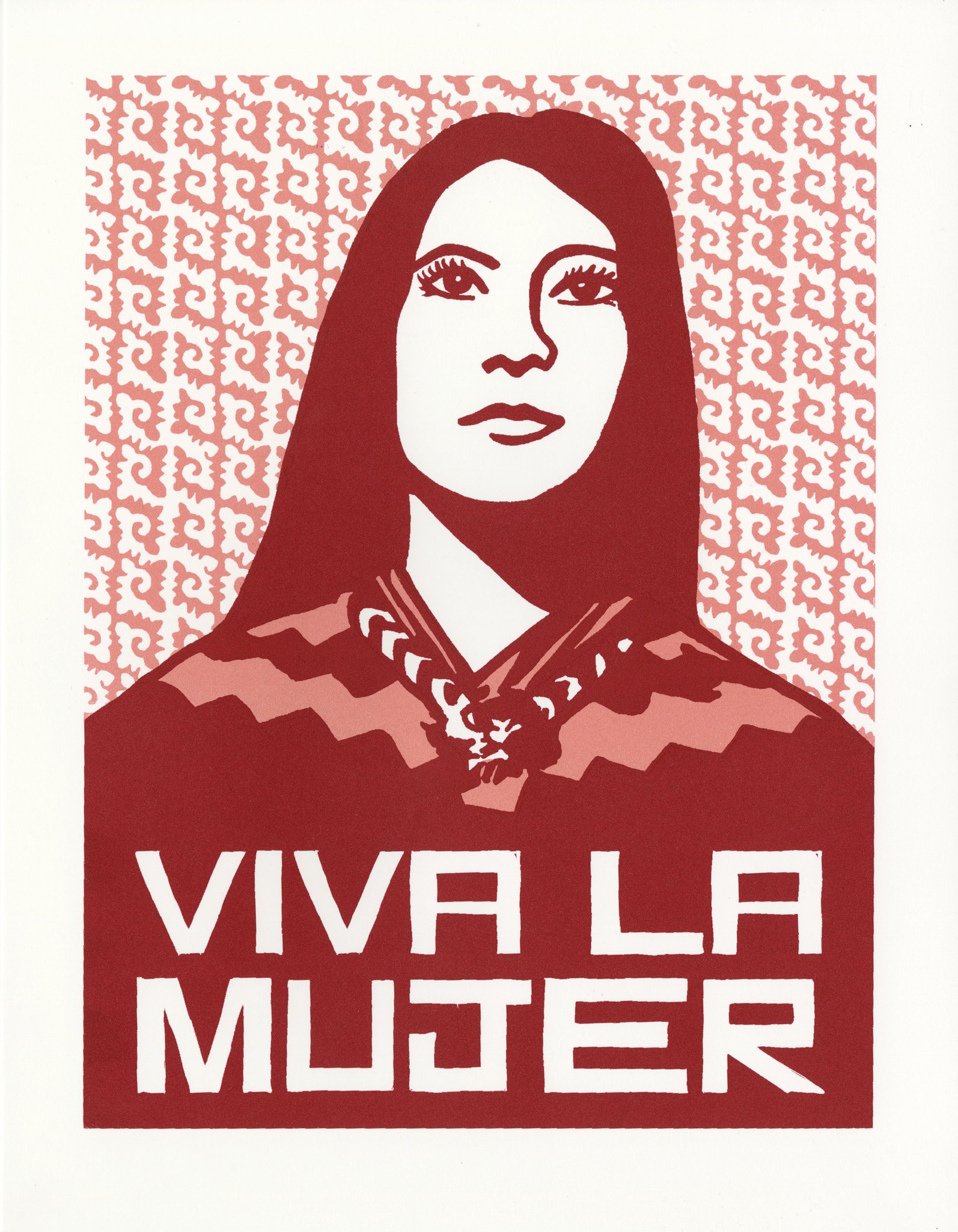 This collaboration mixes Melanie Cervantes' portrait of a Xicana drawn a few years ago with a pattern Jesus Barraza pieced together from an ancient Olmec stone stamp created approximately 3,000 years ago. This mix of ancient and new brings together printmakers across generations. The stamp pattern used was one of many that were created to print on fabric and paper and to express the cosmology of the Olmecs. These elements are combined with the feminist declaration "Viva La Mujer" which affirms the duo's belief that sisters must be at the center and at the forefront of transformational social change.