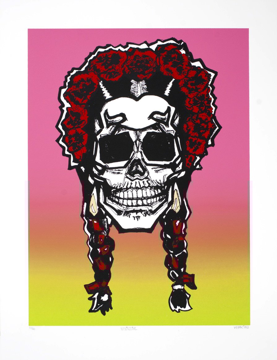 This is a piece we printed for Natalia Garcia P. as part of a collaboration between Xochitl Ceive and Dignidad Rebelde which produced a series of screen prints. Xochitl Ceive is Galego and Nahuatl for Flower of Self Determination, part of their mission is to create offerings to honor the revolutionary legacy of their ancestors, speak truth to power and communicate their demands.